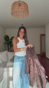Bomber em suede macio, com forro, corte descontraído, bolsos frontais e fecho de correr.